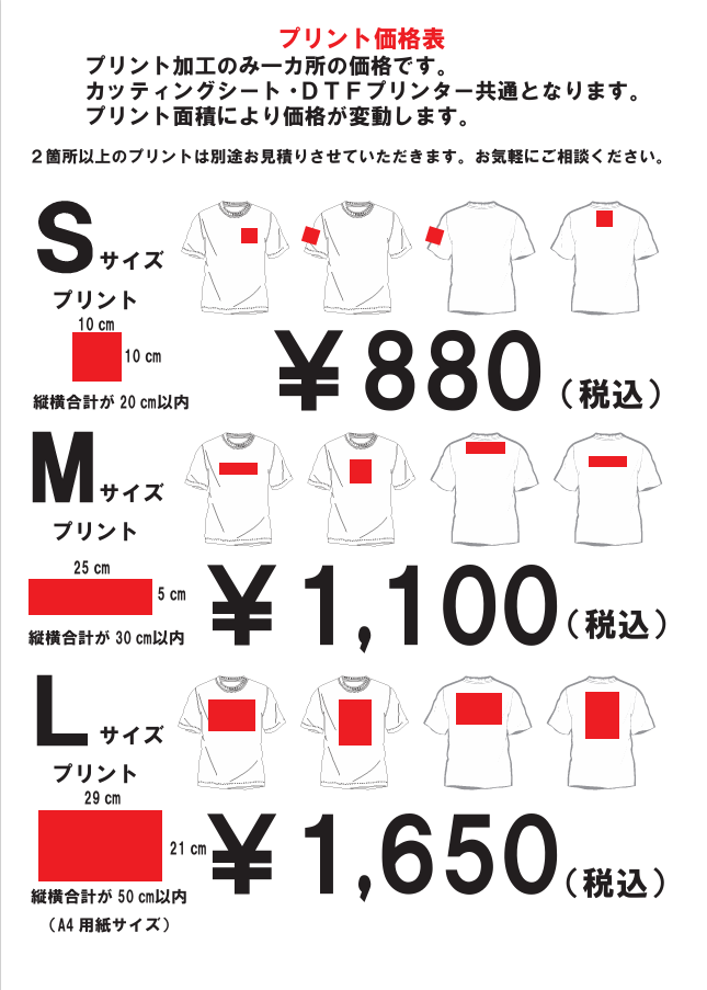 ウェアへのプリントはウェア持ち込み、購入どちらでもOK サイズ別の料金で分かりやすく仕上がりもキレイ!!