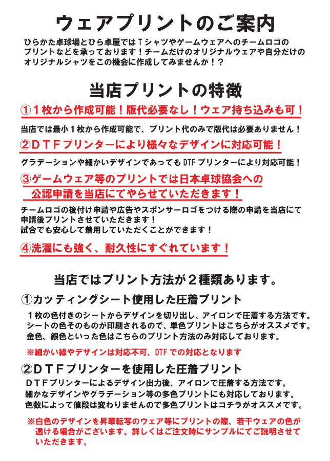 ひらかた卓球場ではオリジナルのゼッケンのプリントやゲームウェアへのチームロゴや広告などのプリントができます!!